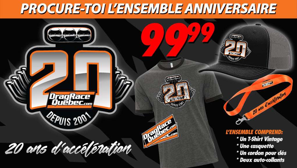 Pour célébrer ses 20 ans, DragRaceQuebec.com vous offre l’ensemble 20e anniversaire comprenant un t-shirt vintage, une casquette, une lanyard et deux auto-collants DragRaceQuebec.com au coût de 99.99$